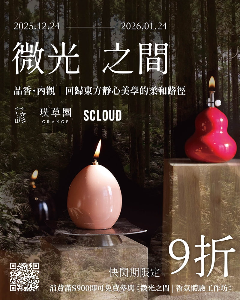 在年底最忙、也最容易忘記呼吸的時候,Scloud 為城市留下一段可以慢下來的空白。以「光」與「香」為媒介,邀請旅居上海的藝術家 言彦 YANYAN,攜手台灣香氛品牌 璞草園 GRANGE,回應東方靜心美學在當代生活中的另一種可能。